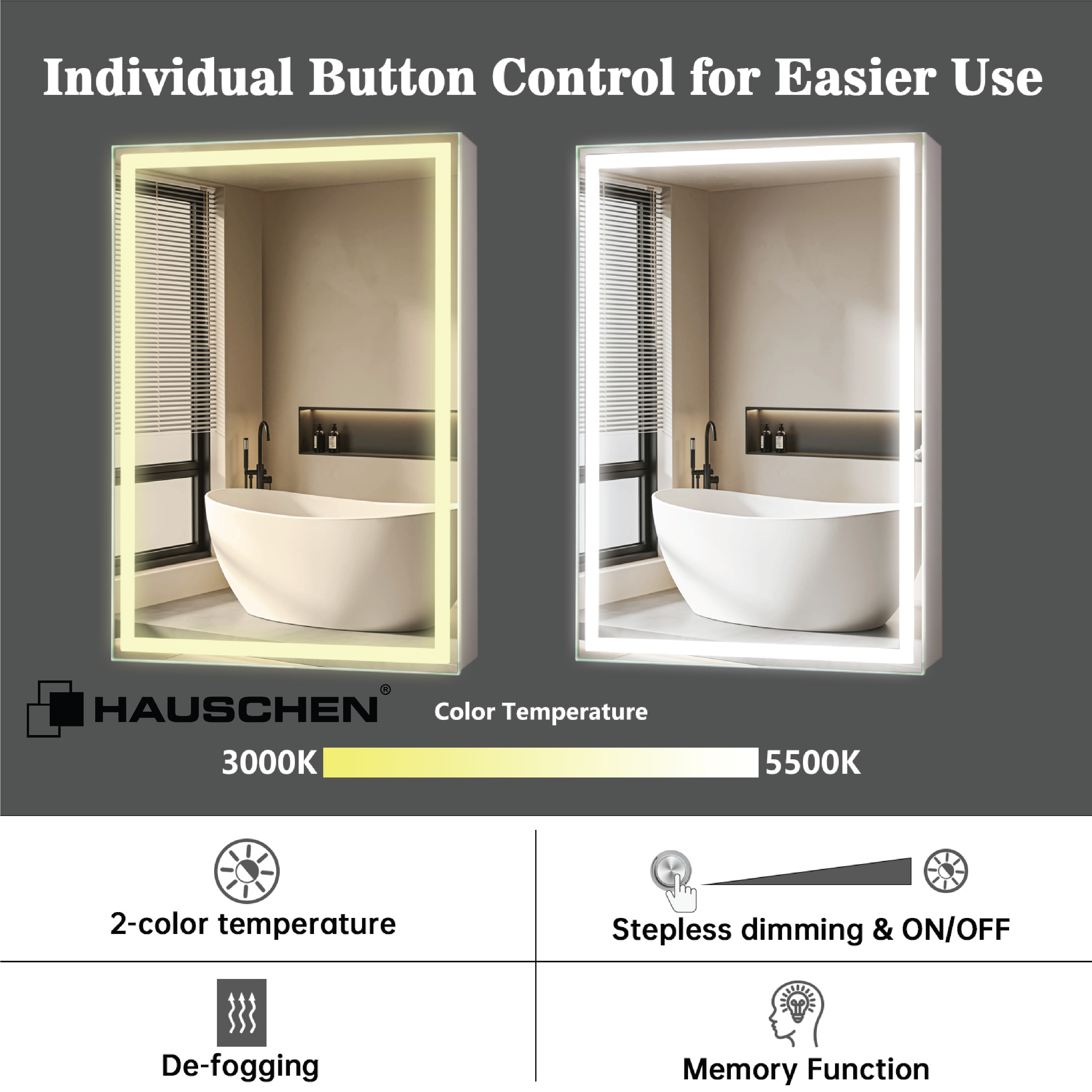 HAUSCHEN 28 x20 Inch LED Medicine Cabinet Lighted Bathroom Mirror, Defogger, Stepless Dimmable, 3000K/5500K Color Temperature Wall Mounted Makeup Mirror, Adjustable Shelf (Assembly Required)